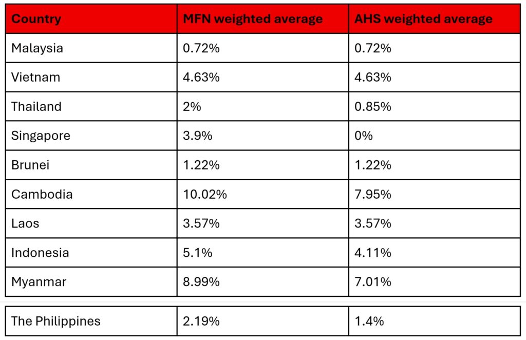Table 1: Most Favoured Nation (MFN) and effectively applied weighted averages for ASEAN countries in 2022