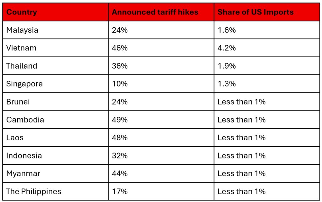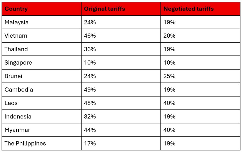 Despite the announced tariff hikes, ASEAN member states have recently managed to secure lower tariffs from the United States, though this is not the case to all.