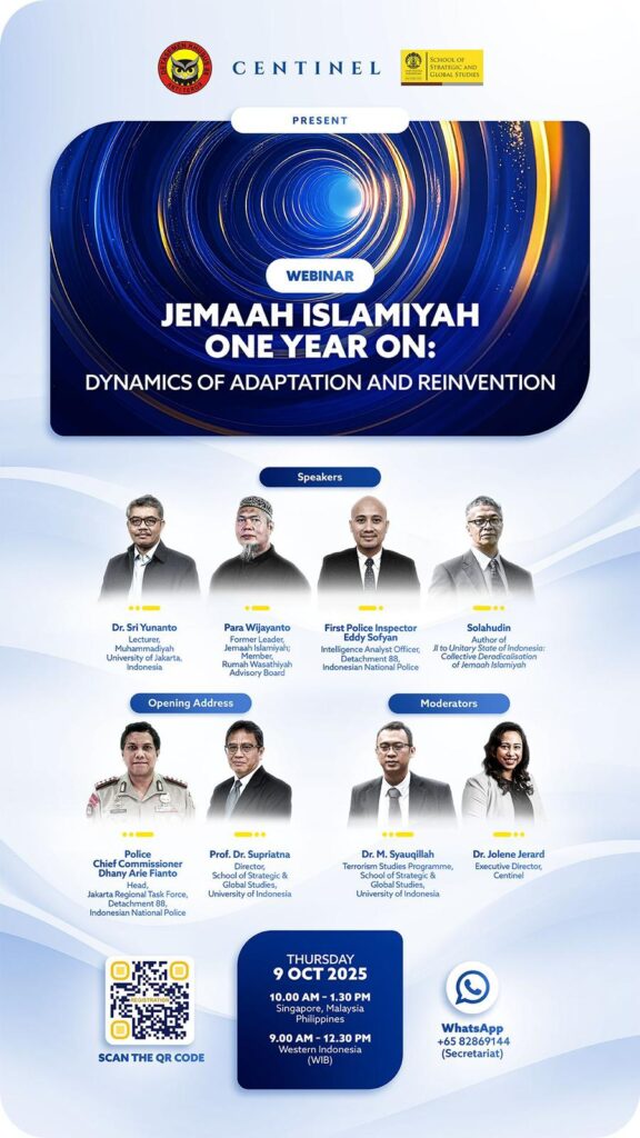 Centinel cordially invites you to join the Detachment 88 – Centinel – SKSG UI Webinar titled: “Jemaah Islamiyah One Year On: Dynamics of Adaptation and Reinvention”